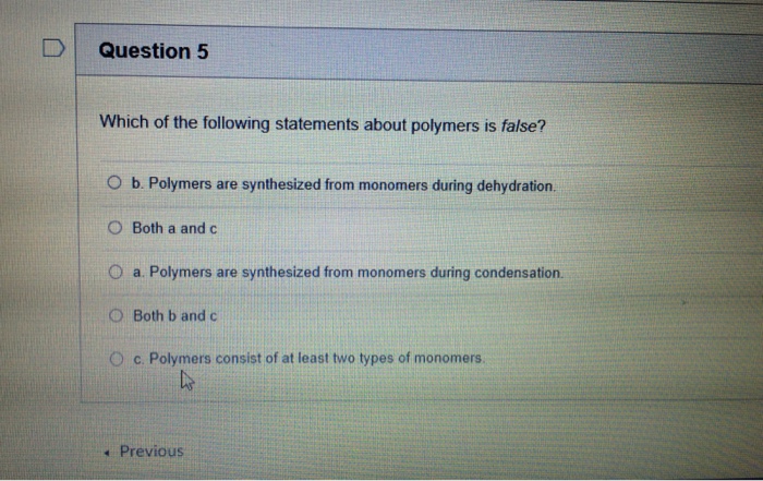 Which of the following statements is false. C Covalent bonds are formed between the monomers. 3 Which of the following statements is false.